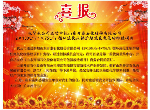 祝贺我公司成功中标山东开泰石化股份有限公司 2x130t/h+1x75t/h 循环流化床锅炉超低氮氧